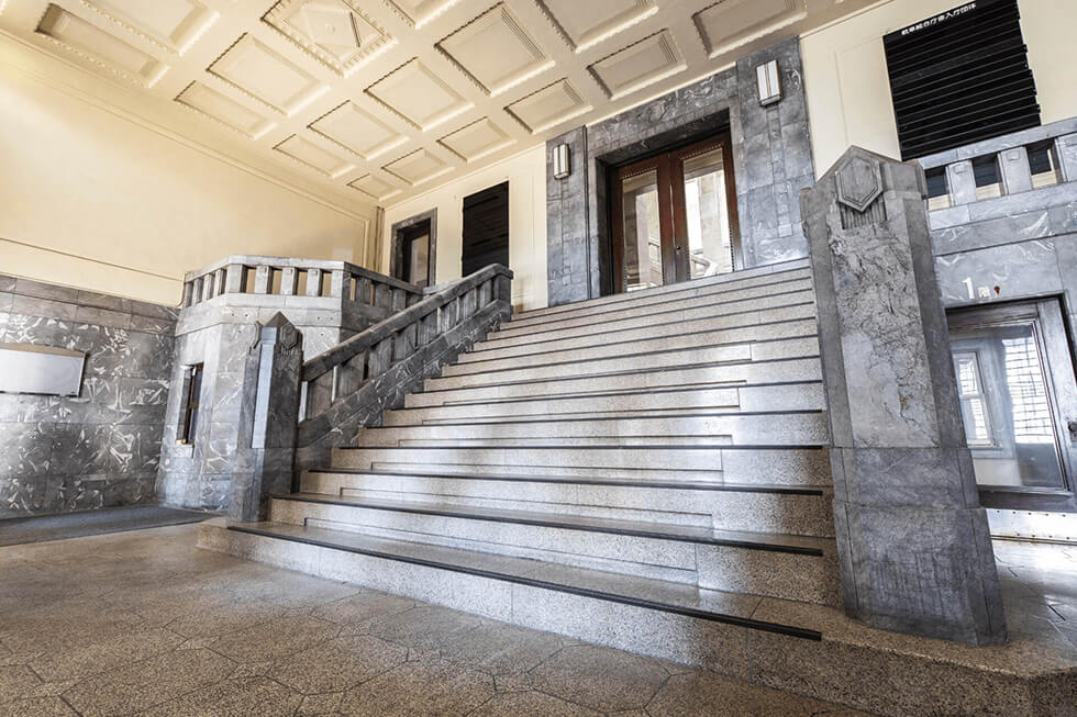 階段は踊り場で左右に分かれるT字型の構成で、階段を囲むように12本の大理石の柱が並んでいます。階段ホールの床には常滑産のモザイクタイルが使われています。