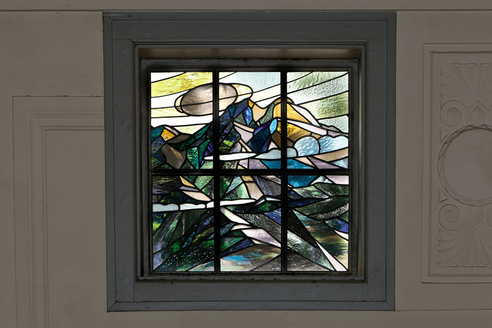 正面玄関の扉は、金属格子にガラス入りで重厚な印象です。玄関扉を抜けると、そこには2階まで延びる正面階段が目に飛び込んできます。さらに、玄関扉上部の壁には6枚のステンドグラスが配置されています。岐阜県の美しい自然や山岳などがモチーフとなっています。